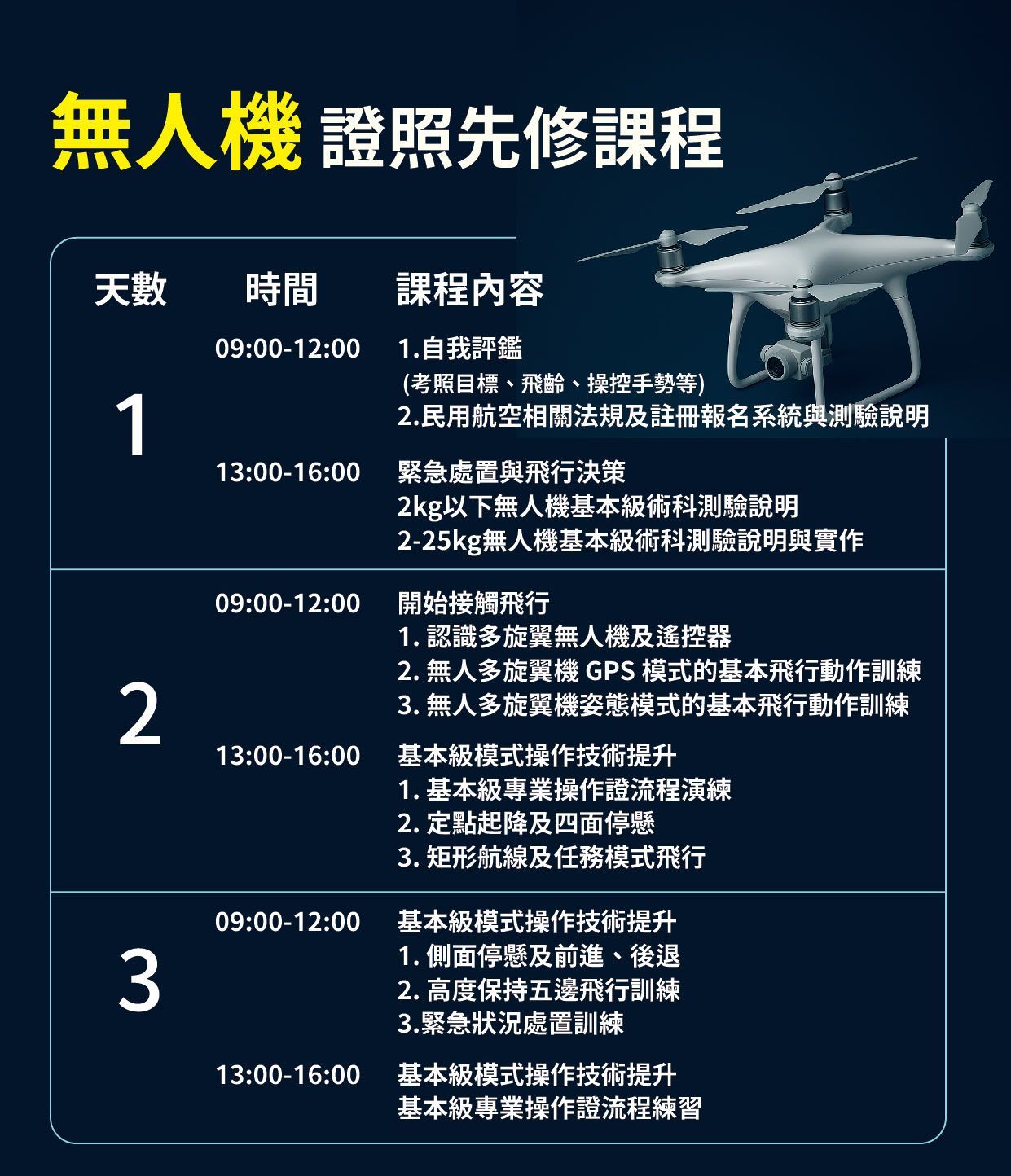 安全規範:請依照講師指示操作無人機。若因學員擅自操作導致設備損壞,需負擔相關維修費用。